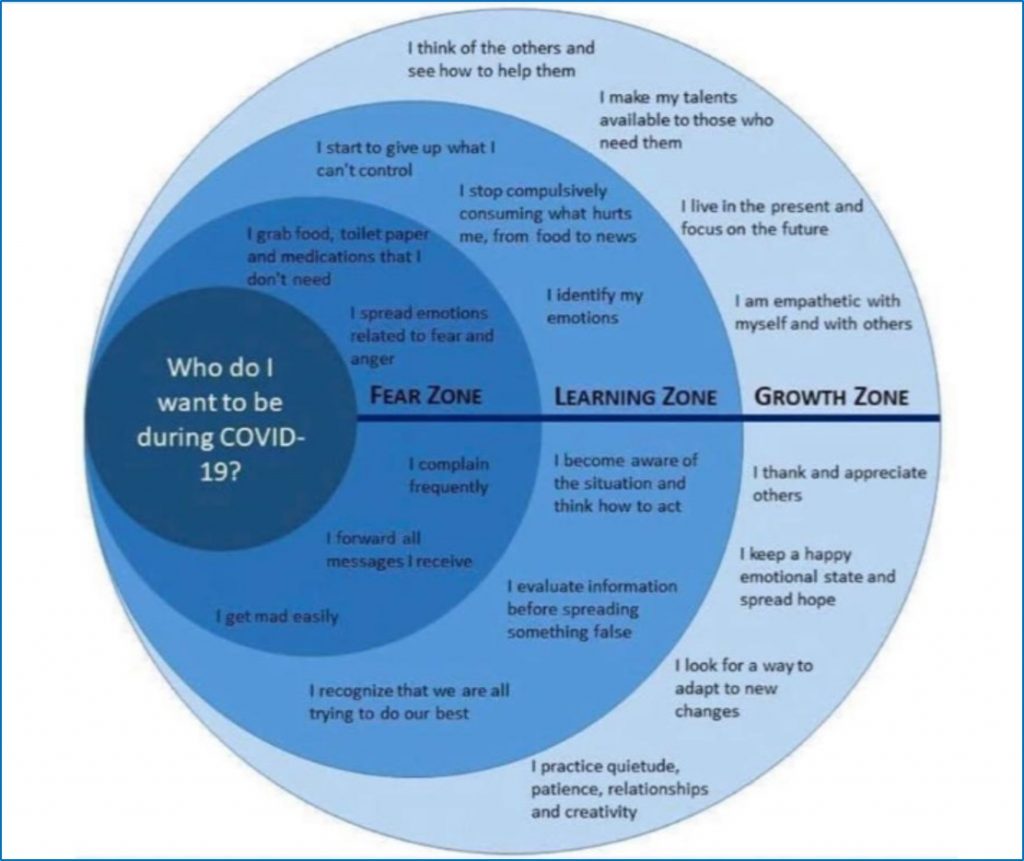 The second zone is the Learning Zone. This can come a little later when things have started to settle and we begin behaving in a less reactionary and more thoughtful and mindful way. We become a little more aware of our own limitations and so worry less about what we are able to control and let go a bit more. We learn to respond in a more measured way rather than react in the moment and we become a bit more circumspect about the information that we consume and how often we consume it. We become more patient with ourselves and one another.